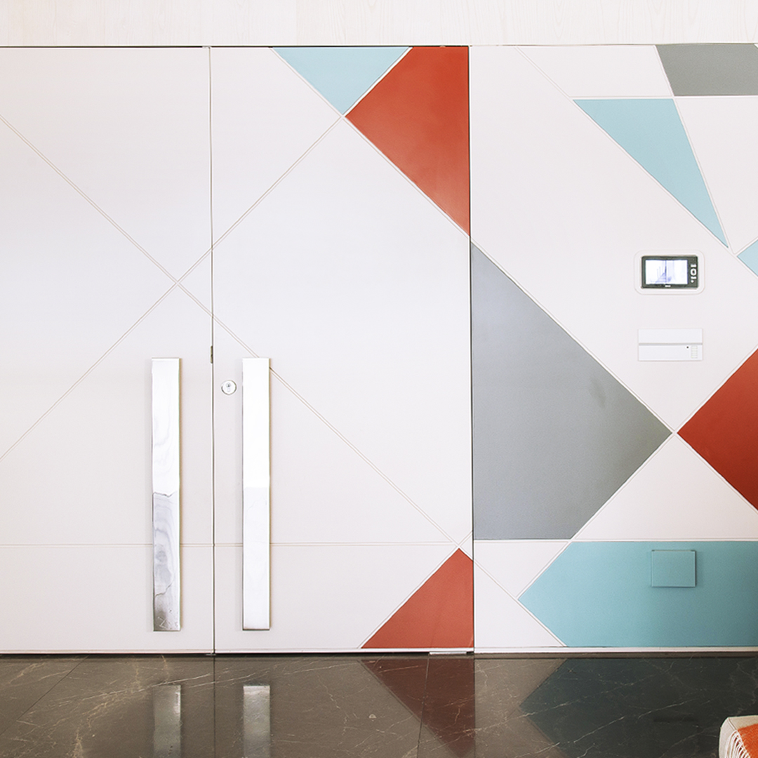 Então eu e minha equipe criamos este painel que começa na porta principal e vai contornando o living em direção a área intima como se fosse uma dobradura de papel, ficou como biombo inspirado nesses “origames” japoneses. 🎏 Para quebrar a monotonia das linhas horizontais, distribui no painel triângulos em ângulos e tamanhos variados que foram pintados em laca laranja bem quente, quase um abóbora contrastado à um azul frio e desbotado.