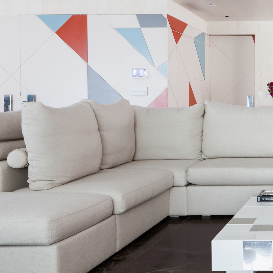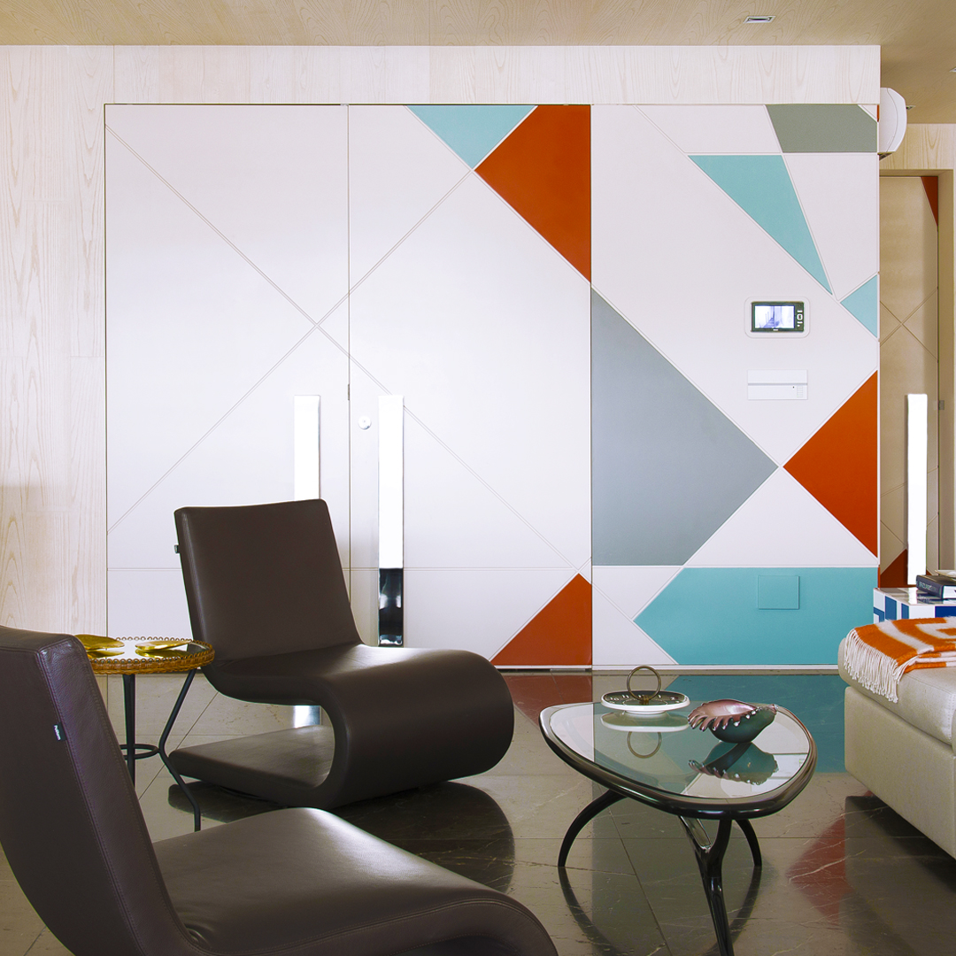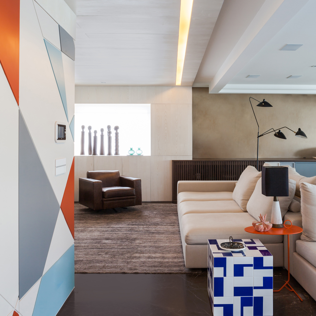 Então eu e minha equipe criamos este painel que começa na porta principal e vai contornando o living em direção a área intima como se fosse uma dobradura de papel, ficou como biombo inspirado nesses “origames” japoneses. 🎏 Para quebrar a monotonia das linhas horizontais, distribui no painel triângulos em ângulos e tamanhos variados que foram pintados em laca laranja bem quente, quase um abóbora contrastado à um azul frio e desbotado.