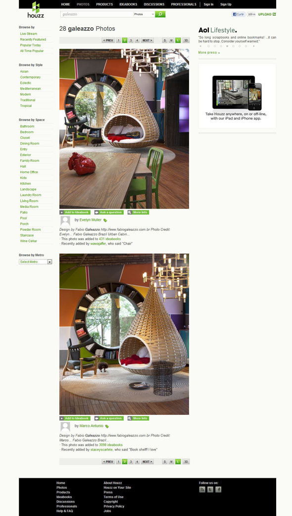 Houzz, com base em Palo Alto na Califórnia, é uma comunidade virtual com mais de 1,7 milhões de usuários. No portal, o usuário navega livremente por uma enorme quantidade de fotos e pode adicioná-las a sua coletânea pessoal de fotos, chamada de “ideabook”. Somando, as imagens dos projetos da Galeazzo atingiram a impressionante marca de serem adicionadas a mais de 5360 ideabooks.