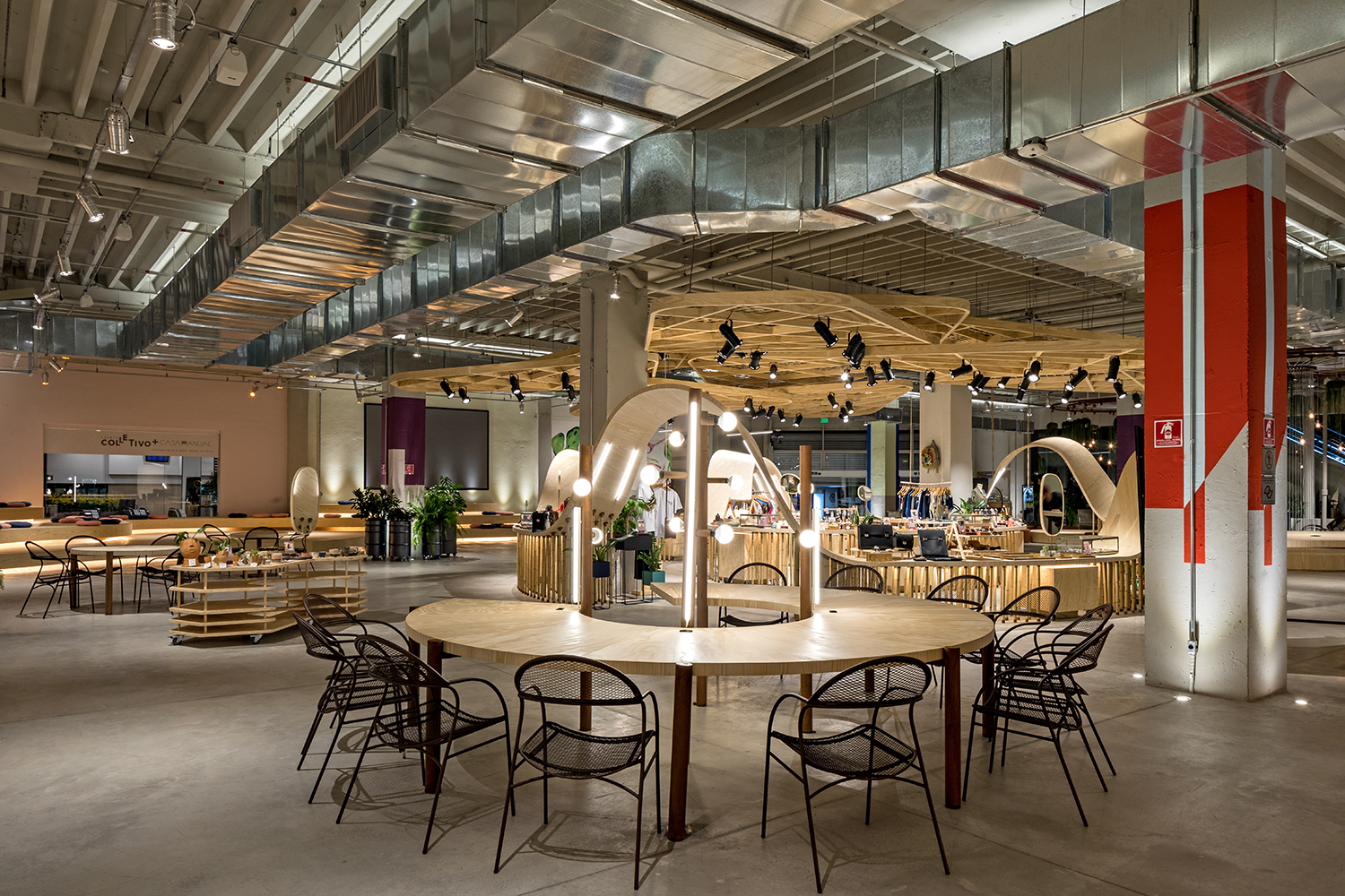 Uma das pesquisas que fizemos foi um mergulho no Mercado Manual, de onde trouxemos motes como a palavra “sonho”. Depois, quando pesquisamos o fazer manual, entendemos que trata-se de uma comunicação entre a cabeça e as mãos por meio do coração. Ou seja, o coração faz uma ponderação entre o pensar e fazer. Isso nos levou a questionar como esse coração distribuiria energias entre o fazer e pensar. Foi quando chegamos à ideia do movimento primitivo, dessa espiral que parte do coração. O Mercado Manual propõe para o experimentador esse contato com a cultura do fazer pela sua pulsação. Pensamos aí em desenvolver essa espiral como um balcão onde as pessoas fazem, cada qual, um percurso num ritmo próprio. E no entorno, estão as ocas do fazer (espaço para as oficinas), do nutrir (restaurante e empório), do cantar (palco), do descansar (mobiliário-lounge), do trabalhar (mesas-cowork) e do brincar (Erê).