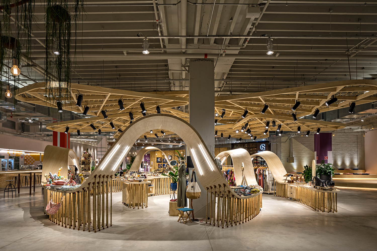 “Desse movimento surgiu o grande expositor/bancada: uma escultura capaz de integrar todo o ambiente em formato de espiral, coroado com 10 pétalas em madeira e bambu no centro do espaço”, conta. Um espaço onde a equipe da MANUAL propõe novas experiências, convivência e troca de saberes norteados pela CULTURA FEITA À MÃO.
